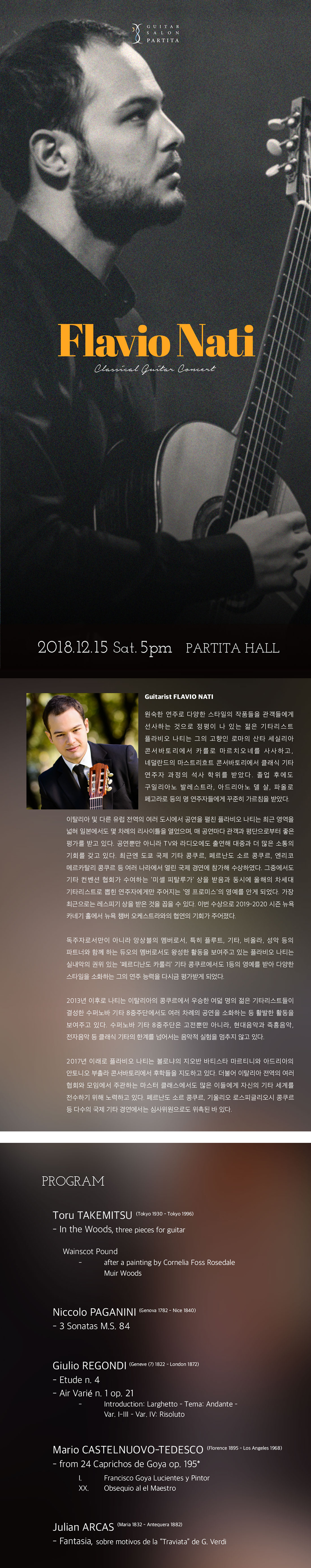 원숙한 연주로 다양한 스타일의 작품들을 관객들에게 선사하는 것으로 정평이 나 있는 젊은 기타리스트 플라비오 나티는 그의 고향인 로마의 산타 세실리아 콘서바토리에서 카를로 마르치오네를 사사하고, 네덜란드의 마스트리흐트 콘서바토리에서 클래식 기타 연주자 과정의 석사 학위를 받았다. 졸업 후에도 구일리아노 발레스트라, 아드리아노 델 살, 파올로 페고라로 등의 명 연주자들에게 꾸준히 가르침을 받았다.