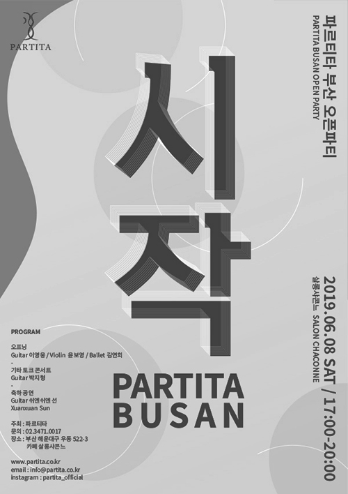클래식기타를 사랑해 주시는 부산지역 애호가 여러분들께 파르티타를 소개하고자 "시작"이라는 테마로 오프닝 파티를 준비했습니다.