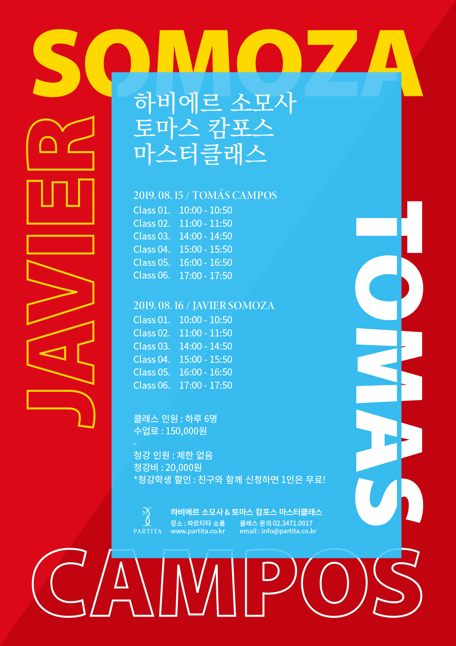 마드리드 왕립음악학교 교수 Javier Somoza와 Tomás Campos의 마스터클래스를 오픈합니다. 8월 16일 금요일에 진행되는 마스터클래스에 많은 참여와 관심 부탁드립니다.