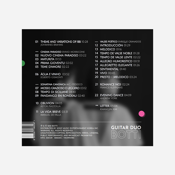 낭만시대 대표 작곡가인 브람스의 현악6중주 1번 2악장 '테마와 변주', 영화 '시네마 천국'의 OST, 남미음악의 거장 지스몬티의 '물과 포도주', 탱고의 아버지 피아졸라 '오블리비언', 스페인 대표 작곡가 파야의 오페라 '허무한 인생 중 스페인 무곡 1번'과 그라나도스의 '시적 왈츠'를 기타 두 대의 편곡으로 연주하였고, 기타 듀오를 위한 오리지널 작품으로는 근대시대 가장 중요한 클래식기타 작곡가 중 한명인 카스텔누오보-테데스코의 '소나티나 카노니카', 프랑스 작곡가인 끌레냥의 '로망스 1번', 미국의 기타리스트이자 작곡가인 엔드류 요크의 '이브닝 댄스'를 담았습니다. 덧붙여 클래식기타의 서정적인 음색에 너무 잘 어울리는 멜로디와 가슴 아픈 가사를 지닌 김광진의 편지까지 보너스트랙으로 함께 합니다. 기타리스트 한은과 허유림… 보티첼리로 처음 만난 이후 마치 강물이 흐르듯 자연스럽게 음악여정을 함께 하였고 때로는 각자, 때로는 함께 음악적인 성장을 동반하였습니다. 작곡가들이 악보에 수놓은 한음 한음에 집중하였고 그 음들의 공간에 보티만의 해석과 색을 입히려고 노력했습니다.