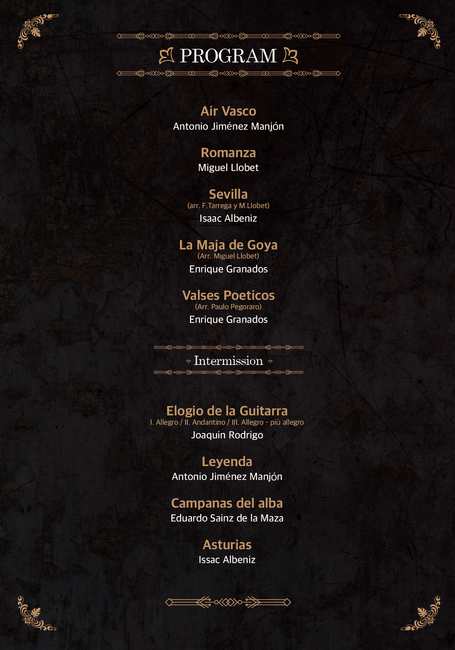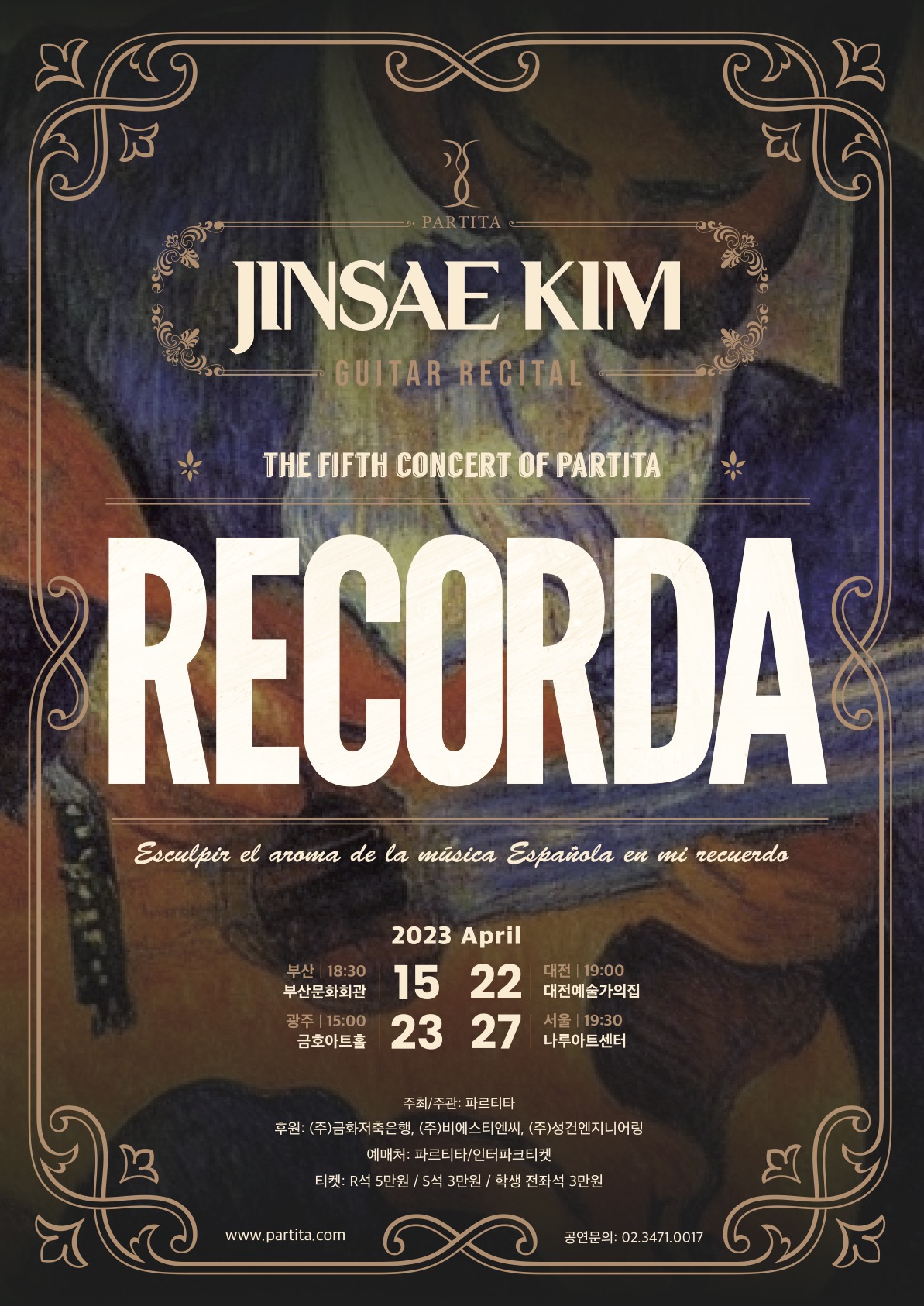 놀라울 정도로 선명하고 섬세하게 다듬어 그만의 정돈된 형태로 표현할 수 있는 그의 음악을 언어로 표현하자면 '내면적 격정의 정돈된 표출'이라고 할 수 있습니다. 그런 그가 우리가 만나보지 못하였던 1~2세기 전 스페인의 풍경과 문화적 분위기, 사람들의 표정에서 읽히는 감정 등을 음악으로 전달해보고자 Recorda('기억하다') 라는 타이틀로 관객들에게 찾아왔습니다.