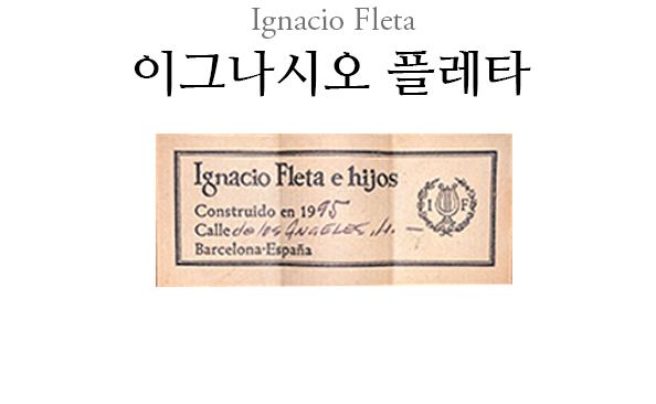 이그나시오 플레타 (Ignacio Fleta)는 엔리케 가르시아(Enrique Garcia)와 이그나시오 심플리치오 (Ignacio Simplicio)를 이어 20세기 스페인 바르셀로나 기타를 대표하는 제작가인 그는, 전설적인 거장 안드레스 세고비아(Andres Segovia)가 그의 기타를 사용하면서, 전 세계의 많은 연주자들로 부터 인정받고 그의 악기를 찾게 되면서 많은 사람들의 로망의 대상이 되었습니다.