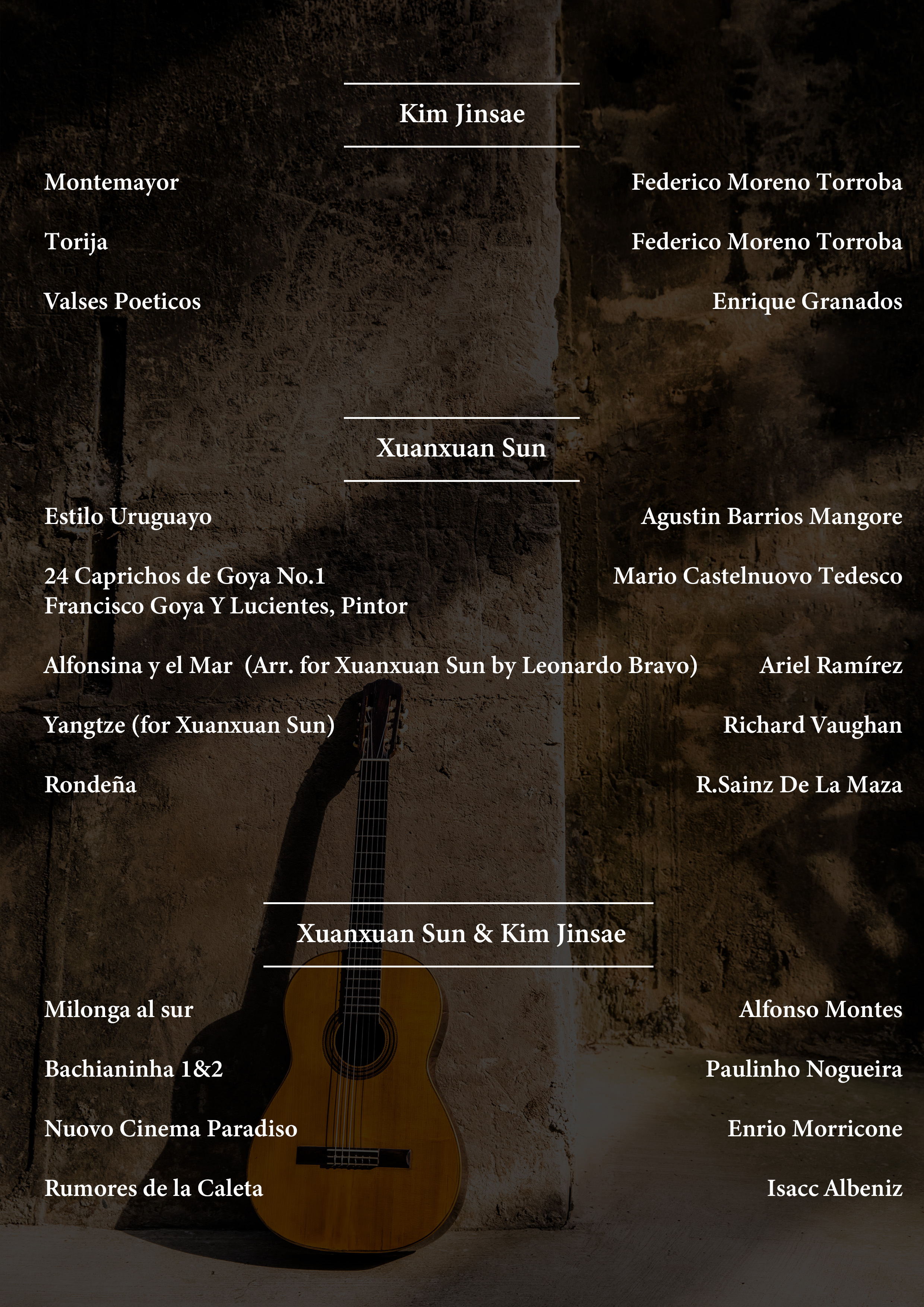 중국 베이징 중앙음악학원에서 전문 연주자 학위를 받은 칭따오 출신의 기타리스트 쑨 쉬엔쉬엔은 매우 어린 나이에 클래식 기타를 접하게 된 후초등학교 5학년 때 첸 지 교수로부터 전문 연주자가 되기 위한 지도를 받기 시작했다. 학업의 과정에 있던 15년 동안 쑨 쉬엔쉬엔은 매년 최우수 장학생 및 국가 장학생으로 선정되기도 했다. 쑨 쉬엔쉬엔은 현재 중국 길림예술대학에서 클래식 기타 교수로 재직하며 후학을 양성하고 있다. 또한 콘서트 연주자로서 여러 국제 기타 페스티벌의 무대에 오르는 등 전세계를 누비며 많은 공연을 소화하고 있으며, 다수의 기타 콩쿠르에 게스트 뮤지션으로도, 심사위원으로도 활약하고 있다. 쑨 쉬엔쉬엔은 중국 전역의 관객들에게도 매우 친숙한 연주자로, 동시에 미디어 등 여러 분야에서 가장 호평받는 아티스트로 평가받고 있다.